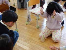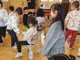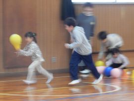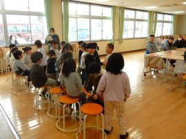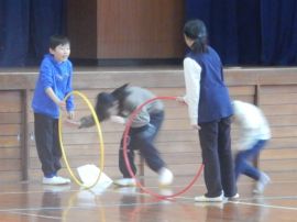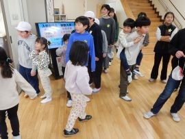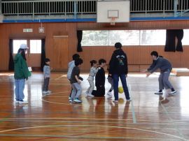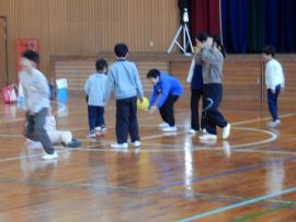 その頃、園児たちは、5年生と一緒に体育館へ移動し、いろいろな遊びを通して交流していました。なぜ何度も5歳児と5年生が交流するのかというと、園児の皆さんが4月に新1年生となった時、5年生も進級して6年生となっているからです。次年度を見越したペアリングなのです。