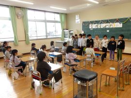 続く国語科の授業体験では、「ものの名前」について学習しました。それぞれのペアでどんなお店屋さんを開のかを決め、商品の絵を描き、店員と客に分かれ、「いらっしゃいませ。」「どの商品にされますか?」と言葉遣いに気を付けながら、楽しそうに取り組んでいました。