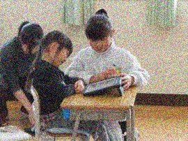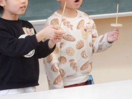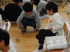 次に、生活科の授業体験です。1年生が園児にこま回しを教えていました。始めに1年生がお手本を見せ、園児に回し方を丁寧に教えながら、ペアで楽しくこま回しをしていました。