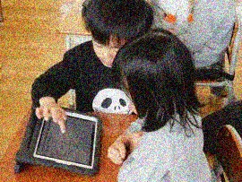 まず、1年生が前に並び、順に自己紹介を行いました。続いて、タブレット型端末を活用した学校クイズを行いました。児童一人一人がペアの園児に問題を読み上げ、回答の仕方を教えながら進めていきました。