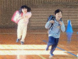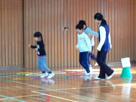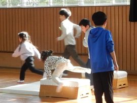 園児と5年生は、こども園でお馴染みの転がしドッジや、5年生が考えたサーキット・トレーニングの要素を取り入れた楽しいレース「学校へ行こう」をして、大いに盛り上がりました。保護者説明会が予定より長くなったので、交流の時間も延長して、思う存分遊ぶことができました。