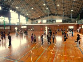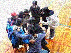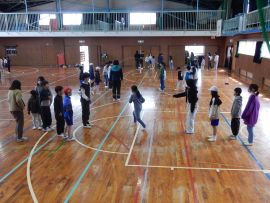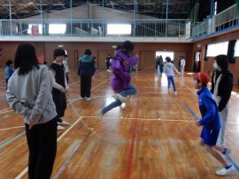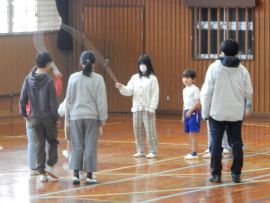 まずは、8の字跳びの練習です。互いに声を掛け合いながら跳んでいきました。中には、円陣を組んで気合いを入れてから跳んでいる班もありました。