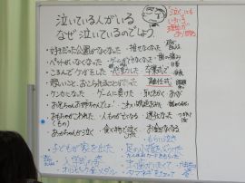 初めに、アイス・ブレイク(「氷を解かすこと」の意味で、初対面などの緊張を解きほぐすための手法)を行い、「泣いている人がいます。なぜ泣いているのでしょう?」ということを考えました。6年生とみわの里の皆様、本学園職員で考えを発表し合いました。子どもたちからは、「好きだった公園がなくなった。」「砂が目に入った。」「ペットがいなくなった。」「ゲームができなくなった。」「歯が痛くなった。」という回答がありました。みわの里の皆様からは、「子どもが大学生になって家を出た。」「足の小指をぶつけた。」「冬季オリンピックで金メダルを取った姿に感動した。」「誕生日のカードをもらった。」などの回答がありました。互いにいろいろな感情から出る涙を連想していて面白かったです。