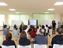 さて、認知症の予防には、「趣味の活動、指先を使った作業、役割と生きがいを持つと言った『脳の体操』が良い」とのことでした。そこで、みわの里で行っている指や腕を使った体操を体験させていただきました。両手を前に出し、指を順に折ったり開いたりする運動や、左手を右耳に、右手を鼻に置いて、手を交互に入れ替える運動、片方の腕を前に出して「グー」、もう片方の腕を胸に付けて「パー」にして、交互に腕を入れ替える運動などなど、多くのバリエーションを体験しました。これがなかなか難しく、子どもたちも学園職員も、頭をフル回転しながら取り組み、大いに盛り上がりました。