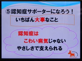 「私は、今日の話を聞いて、認知症の人には、『優しく声をかける』『大人の人に相談する』『地域のみんなで関わっていくこと』が大切だと知りました。何か覚えたりすることは難しいけど、思いや気持ちは残っているということが分かりました。認知症の人を見かけたら、優しく声をかけ、困ったら大人の人や周りにいる人たちに声をかけてこうどうしようと思いました。」