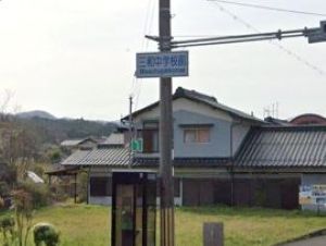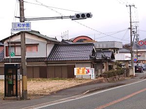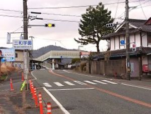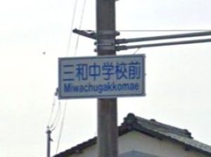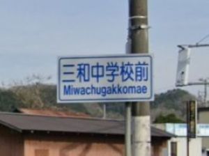 三和学園に最寄りの国道9号線の交差点。ここには長らく「三和中学校前」という交差点名標識が掛かっていました。三和学園が平成31(2019)年4月に開園した後もずっと「三和中学校前」のままでした。