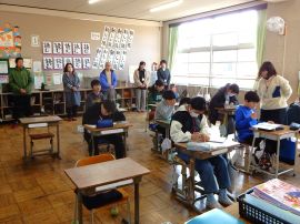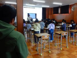 まず、三和学園の学習参観をお世話になりました。短時間ながら、音楽科でリコーダーを演奏している場面や、数学科でICTを有効活用している場面など、各学年の様子をお見せすることができました。1年生は、三和創造学習で、株式会社京都庵の見学に出かけるところでした。委員の皆様に手を振ったりハイタッチしたりして元気に出発しました。