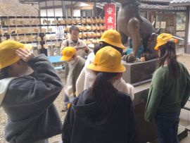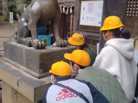 大原神社の本殿前の狛犬は、戦時中に金属として拠出されるところでした。ですから、切断された線が、今も痛々しく残っています。そこ狛犬は、鉄ではなく青銅製であったので、修復され、元の場所に戻ることができたのです。また、狛犬の足下には、多くの寄付によって造られたものであることが記されていました。子どもたちは、興味深く狛犬を観察していました。