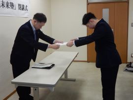 閉講式では、まず、修了証書の授与がありました。受講者は皆、キビキビとした態度で修了証書を受け取ることができました。