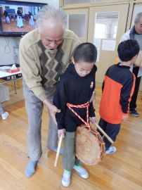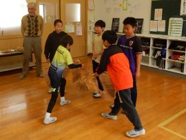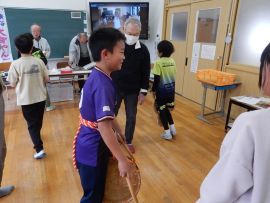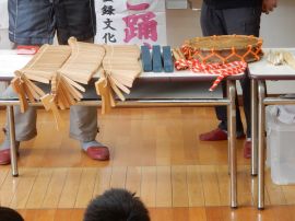 講師の皆様にビンザサラや太鼓、笛の鳴らし方を教えていただきながら、4年生もヤンゴ踊りを体験することになりました。やってみると、音は鳴るものの、保存会の皆様の音とは違う…。笛に至っては、音を出すことも難しかったです。子どもたちは、教えてもらいながら熱心にビンササラを振り、太鼓を叩き、笛を吹いていました。ビンザサラは、籾を箕ですくう動きなのだと教わりました。