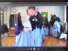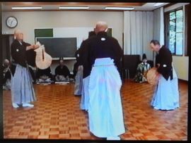 さて、ヤンゴ踊りは、55歳以上の男性が演者で、紋付き・袴を着て、白足袋を履き、白扇を襟元に差します。笛一人、太鼓一人、ビンザサラ3人の計5人が1組となって、2組が踊ります。円の真ん中に笛が立ち、太鼓とビンザサラが左回りに3周します。1周回るごとに、「ヤンゴー。」と言って、演者は円の内側に向かい、再び広がります。最後は、演者が連なって笛と太鼓に合わせて早足で左回りに回る「三日月締め」で終わります。1組目が終わると、2組目が同様に踊ります。昔は、1組が6周、閏年には7周していたというから驚きです。