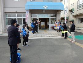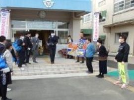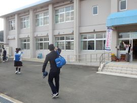 下校時、昇降口で教員や同級生が三和学園の横断幕と共に、最後の応援をして見送りました。