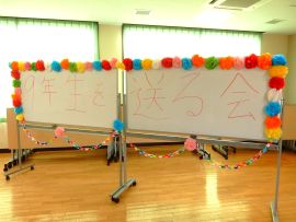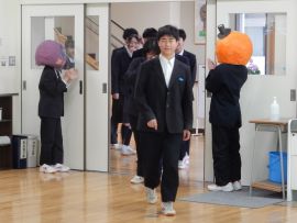 3月11日(水)に、生徒会と7・8年生を中心に、「9年生を送る会」を開催しました。三和学園マスコットキャラクターのR me canとレザンヌがドア係として待機し、合図とともに扉を開けると、7・8年生の大きな拍手で9年生が入場しました。