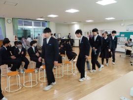 続くレクリエーションは、生活委員会・保健体育委員会プレゼンツ「イス取りゲーム」でした。第1ゲームは、全員対抗で行い、1回ごとに4脚ずつ椅子を減らしていき、最後まで勝ち残った5人が優勝です。同じやり方で、第2ゲームは、体育祭の色集団ごとに行いました。最後の第3ゲームでは、学年対抗でした。3か所に分かれて各学年の1位を決め、3人で決勝戦を行いました。