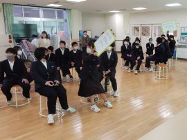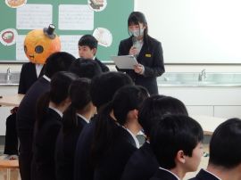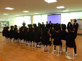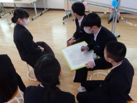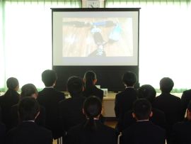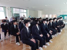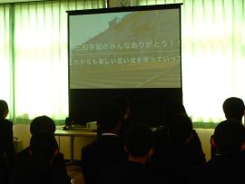5分間の休憩を挟んで、学級委員会がこの日のために作成した「メッセージ動画」が上演されました。9年生の卒業をお祝いし、ありがとうの気持ちを伝える内容で、小学部の児童も登場しました。各学年の凝った演出の数々に、9年生が歓声や感嘆の声を上げ、とてもうれしそうな表情で見ていました。上映後に、7・8年学級委員から、ありがとうのメッセージを生の声で伝えると、照れくさそうにしていた9年生でした。