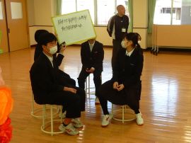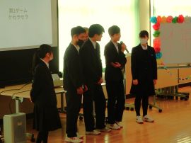 第3ゲームの「イス取りゲーム王者」には、見事9年の西山さんに決まりました。王者は、「来年度の目標」を語らなくてはいけません。西山王者は、「高校生となるので、新しいクラスに慣れることと、勉強をがんばります!」と熱く語ってくれました。とにかく、尋常じゃないテンションを見せていました。プレイヤーも見ている人も大いに楽しめたゲームでした。