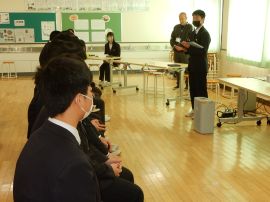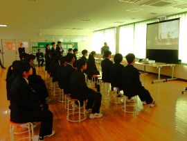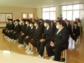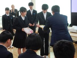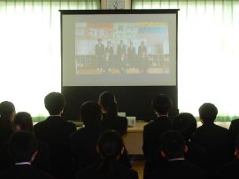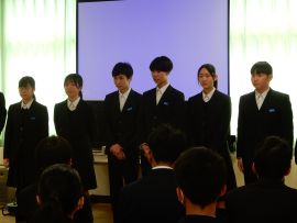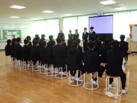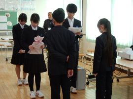 スライドショーが終わると、9年生から在校生への期待のメッセージが伝えられ、今年度の「受験体験記」が贈呈されました。また、校長へも、教職員へのメッセージと「受験体験記」が贈呈されました。