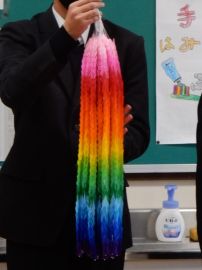 三和学園ニュース3月18日(水)の下校の会にて、8年生が小学生に、千羽鶴完成の報告と協力のお礼を言いに来てくれました。この千羽鶴は、8年生が3学期の朝の会に、小学部各学年に依頼し、折り方を教えながら一緒に折った鶴を集めたものです。三和学園の全児童生徒の手による千羽鶴なのです。