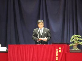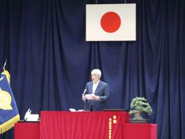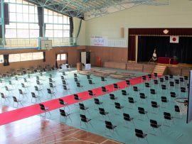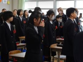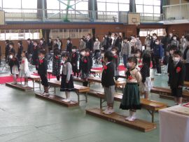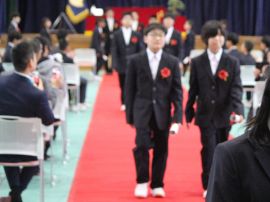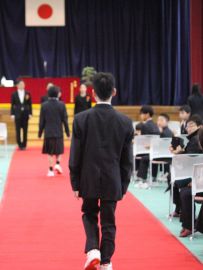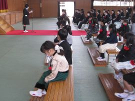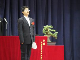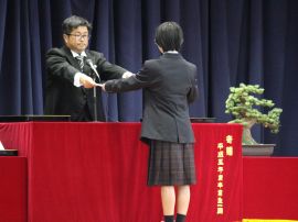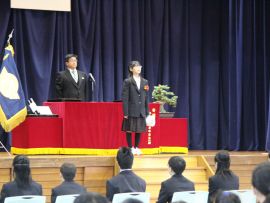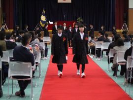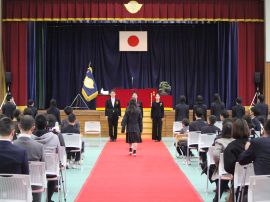 午前9時30分卒業生入場。真剣な面持ちで入場する卒業生を、会場にいる全ての人が温かな拍手で迎えました。卒業証書授与が始まると、校長から証書を受け取った卒業生一人一人が、壇上で「成長の辞」を述べました。6年間の成長、中学校やその先の将来に向けた目標などを堂々と述べていて、とても頼もしく感じました。