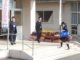 「先日、ある会社の方から、学校に電話がありました。『仕事をしていたら、三和学園の生徒が、今帰りましたって元気にあいさつをしてくれましてね。最近あいさつをしてくれる子どもさんが福知山に少ないから本当にうれしくって、何かできることはないかって思いまして、これを作ったので卒業式に飾ってください。』と言って、この看板を頂きました。そう言われて、私は、とても誇らしく思いました。卒業式の来賓の方にも紹介しました。皆さんとてもうれしそうに、『いい話やなあ。』と感心されていました。三和学園の生徒の一言のあいさつが、たくさんの人を幸せにしました。」