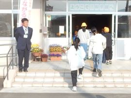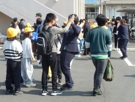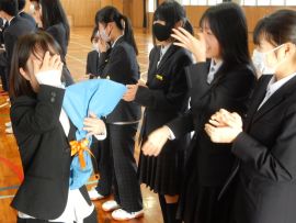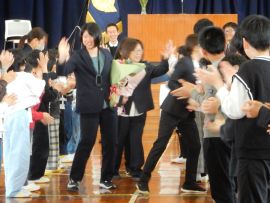式のクライマックスには、児童生徒、教職員で花道を作り、退場される先生方を温かく見送りました。転任者が会場を出ると、高校生となった卒業生が待っていて、久し振りの再会を果たしました。