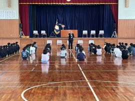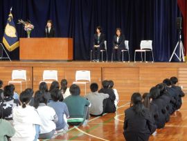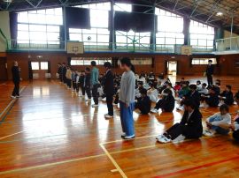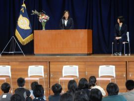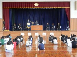 校長が転出する5名の教職員を紹介した後、お一人お一人からごあいさついただきました。児童生徒は、先生方の目を見て、しっかりと話を聞いていました。