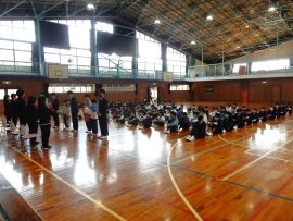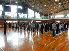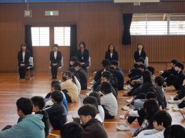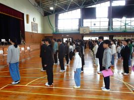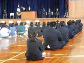 児童生徒が入場すると、中学部教務主任から、離任式に向けて、「転任される先生方がお話をされますので、顔を上げてしっかり聞きましょう。」と、事前指導を行いました。