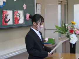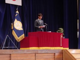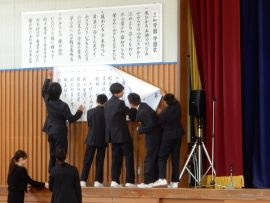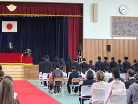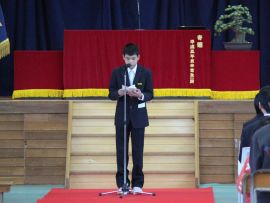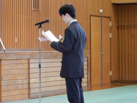 続いて、新入生を代表して、新7年の横田さんが誓いの言葉を述べました。「私たち中学生18名と小学生9名は、大きな希望を胸に、新しい一歩を踏み出そうとしています。私たちをいつも見守ってくださる地域の皆様、学校の先生方や、先輩の方々、私たち新入生一同は、目標に向かって精一杯努力することを宣言し、誓いの言葉とします。」と堂々と述べていました。