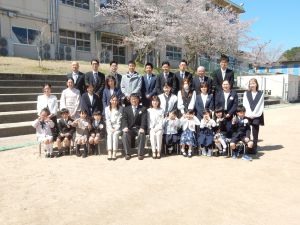 新1年生、新7年生の順に退場した後、晴天のグラウンドで入学記念写真を撮りました。桜の花がきれいに咲いていました。