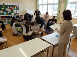 新1年生は、保護者と一緒に登校です。受付では新6年生が待っていて、新1年生の荷物を持ってあげたり手を引いたりして、教室へ案内し、座席やロッカーの場所を教えていました。新6年生もやる気満々のスタートです。