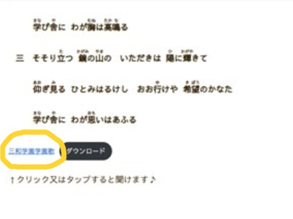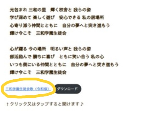 コンピューターの方は、ホームページ画面の上部「本校について」→「三和学園 学園歌」又は「三和学園生徒会歌(令和版)」を開き、歌詞の下にある青文字をクリックしてください。