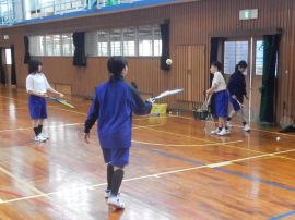 ソフトテニス部では、ラケットの持ち方や振り方、ボールの打ち方などを教わりました。打つ強さをコントロールすることの難しさを知ることができました。