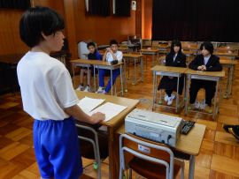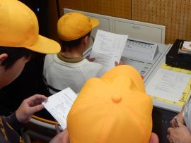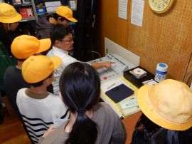 広報委員会は、放送室で放送機器の使い方を確認しました。小学部の広報委員は、実際に機器を操作してマイクを使う練習も行いました。