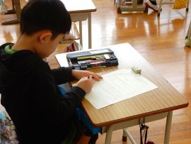 訓練後は、「話をしっかり聞けたか。」「誘導放送聞き終わってから避難することができたか。」「避難時の注意事項を守れたか。」「先生の指示に従い行動できたか。」「真剣な態度で訓練できたか。」という点について各教室で振り返りをしました。