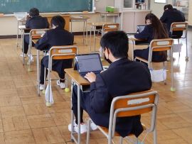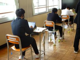 4月21日(火)に、9年で英語の「読むこと」「書くこと」「聞くこと」の調査と、生徒質問調査を実施しました。後日実施する国語と数学は紙ベースですが、英語と生徒質問調査については、タブレット型端末での解答です。英語の「聞くこと」については、ヘッド・フォンを着けての検査でした。