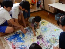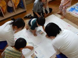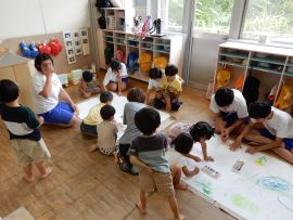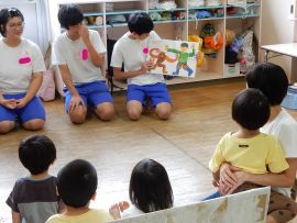 いよいよ園児との交流の時間です。うさぎ組(3歳児クラス)では、絵本『できるかな?あたまからつまさきまで』の読み聞かせとお絵描きをしました。絵本の読み聞かせでは、園児たちが動物の動きを真似しながら楽しそうに聞いていました。お絵描きでは、園児たちのリクエストに生徒が応えながら、動物や花、新幹線などを描いていました。