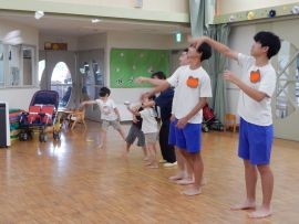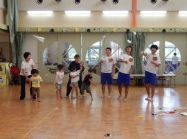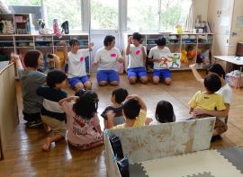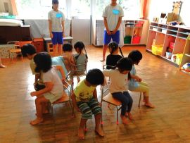 ぞう組(5歳児クラス)では、シルエット・クイズと椅子取りゲーム、ハンカチ落としを行いました。黒いシルエットの動物が何かを当てるクイズでは、園児たちが次々テンポ良く答えていました。椅子取りゲームは、大変盛り上がり、余りの面白さに園児たちが第2回戦をリクエストしていました。続くハンカチ落としでは、初めて行う園児が数名いましたが、ルールや進め方を理解すると、とても楽しんでいました。