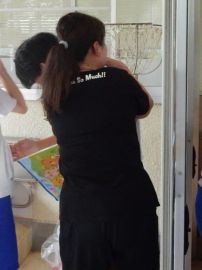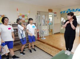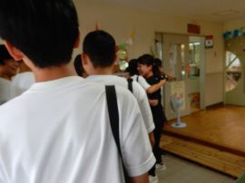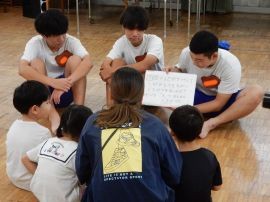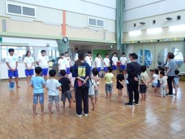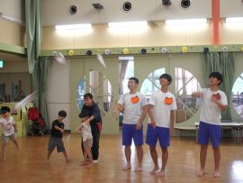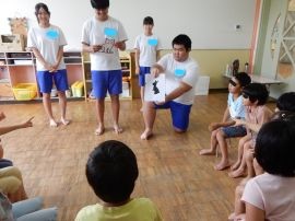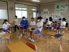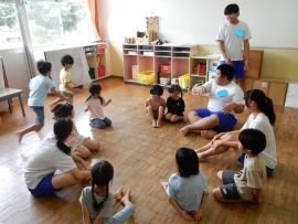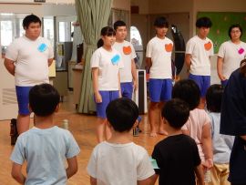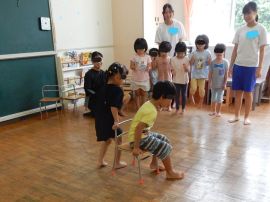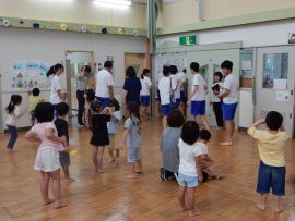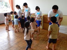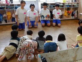 この日は、とても蒸し暑かったので、「雨の日の交流」を行うことになりました。各教室では、園児たちが待ってくれていました。代表生徒が、「今日を楽しみにしてきました。仲よく遊びましょう。」とあいさつし、続いて生徒一人一人が「○○○○です。よろしくお願いします。」と、園児たちに伝わるようにゆっくりハッキリと自己紹介を行いました。