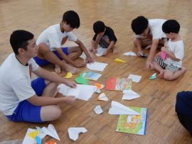 くま組(4歳児クラス)では、クイズと紙飛行機作りを行いました。クイズでは、「体が黄色くて首が長い動物はな~んだ?」「鬼は鬼でもご飯でできた美味しい鬼はな~んだ?」といった問題が出されていました。園児たちが瞬時に正解を答えるので、あっという間に終わって紙飛行機作りに移行しました。園児と生徒で、長い距離を飛ぶようにするため、工夫しながら何機も作成していました。