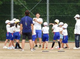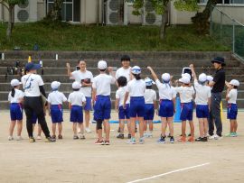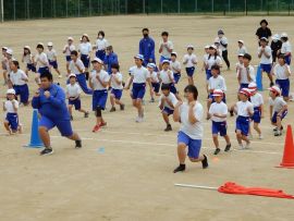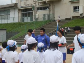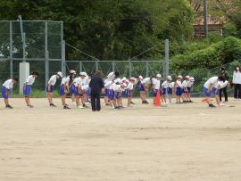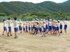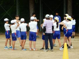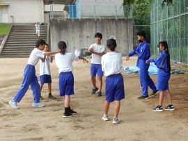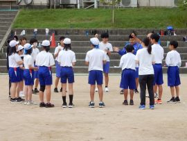 続いて色別練習に入りました。どの色も「声の大きさ」が今回のテーマでした。「しっかりお腹から声を出そう!」「笑顔も忘れずに!」といった9年リーダーの声が響いていました。三和学園の広いグラウンドでは、児童生徒の声は、悲しいまでに四散してしまいます。そこで、小グループに分けるなど、工夫しながら幾度も練習を重ねていくと、各色とも、次第にその声、動きにダイナミックさが出てきました。
