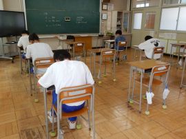 英語検定には、筆記だけでなくリスニングもあります。受検に臨んだ児童生徒は、時間一杯がんばって書き、リスニングに耳を澄ましていました。