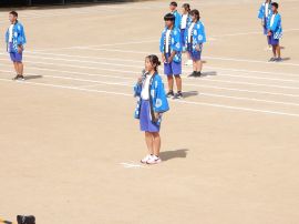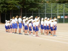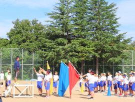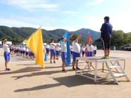 10月2日(木)秋晴れの空の下、三和学園第7回体育祭を開催しました。「今年度のスローガンは、『前進 ~ふみだそう みんなで~』です。暑く苦しい中でも練習をがんばってきました。全力で表現し、思い出に残る体育祭にしましょう。」という児童会・生徒会代表のあいさつで始まりました。