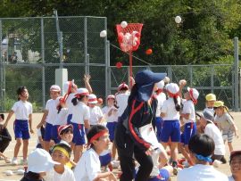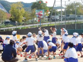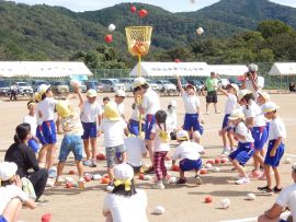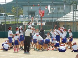 三和こども園の園児の皆さんには、玉入れに参加してもらいました。今年度は、各色に園児が混ざって一緒に競技をしました。皆とても楽しそうでした。