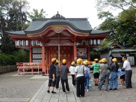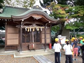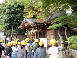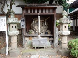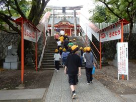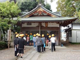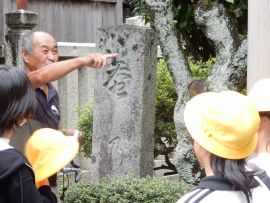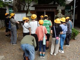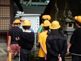 この後、短時間自由に見学する時間が与えられました。その時に子どもたちの心を捉えたのが、堤防神社の西側にある叶石でした。この石は、「子持ち石」とも呼ばれており、この神社に奉納された霊石であるとのことです。悲願成就の霊験を讃え、誰言うとなく叶石と呼ばれるようになったそうです。多くの子どもたちが石の前で手を合わせていました。