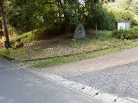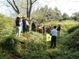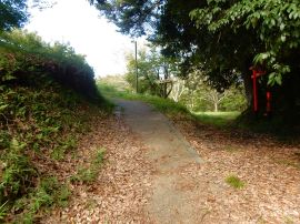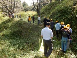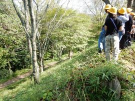 まず、城山にある猪崎城跡へ行きました。猪崎城は、織田信長に丹波平定を命じられた明智光秀が攻略した塩見氏の居城でした。小高い山上に築かれた山城で、中核部分の主郭(近世城郭でいう本丸)は、東西約45m・南北約50mあります。