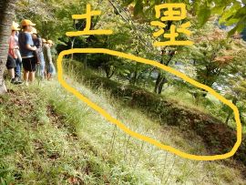 現在も多くの遺構が残っており、1学期に登った友渕城(西の古城)とはまた違った趣がありました。(友渕城についての記事は、令和7年7月4日「6年三和創造学習 西の古城に登りました | 福知山市立三和小学校・三和中学校(三和学園)」をご参照ください。)猪崎城の土塁(敵の侵入を防ぐ城壁)や曲輪(城域を形作る平坦な区画)、矢倉台は、明確に判別できるくらい残っていました。特に土塁は、たとえ大軍が攻め上ってきたとしても、少人数で容易に撃退できるという気持ちにさせられました。