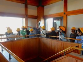 次に、バスで福知山城へ行きました。戦国時代に明智光秀が丹波平定を果たしてから取り組んだ治水事業は、福知山の人々にとってとても大きな出来事でした。光秀は、「暴れ川」由良川の洪水を防ぐために、大堤防を築いて川の流れを90度変えました。それが蛇ヶ端御藪です。その大事業が成される前は、由良川が現在の福知山城下から市内へ流れ込んできていました。光秀が蛇ヶ端御を築き、川の流れを変えたことによって、後の福知山の発展につながったのです。