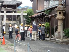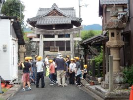 玉垣には、「大阪御堂筋 上村重助」といった問屋の名前が記載されていました。事前学習で学んだ大阪との関連がここに見ることができました。(事前学習についての記事は、令和7年10月8日「6年三和創造学習 校外学習事前学習を行いました | 福知山市立三和小学校・三和中学校(三和学園)」をご参照ください。)