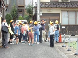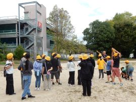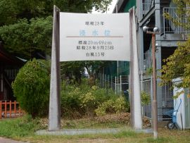神社前の公園には、昭和28(1953)年9月の台風13号による水害の被害を後世に伝えるために、市街地を覆った水の水位20m69cmを記した看板が建てられています。自分たちの頭上を遙かに超える水位に、子どもたちは驚いていました。