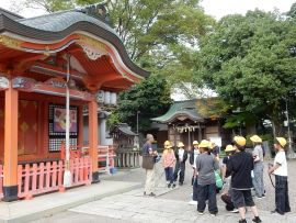 バスに乗車し、明智光秀が祀られている御霊神社に着きました。光秀には、主君である織田信長を倒したことから逆臣のイメージがあります。しかし、由良川の氾濫を防ぐ堤防を築き、城下町建設に当たり地子銭(土地税・住宅税に相当)を免除するなどの善政を行いました。朽木植昌が福知山城主だった宝永元(1704)年、植昌は、光秀の御霊を東中ノ町の榎神社に合祀しました。光秀の御霊を祀ることから「御霊神社」と呼ばれるようになったのです。元々は、宇賀御霊神を祀る稲荷社と、光秀を祀る菱屋町の常照寺と分かれていました。御霊神社は、広小路の拡張に伴い、大正7(1918)年、現在の西中ノ町に移設されました。